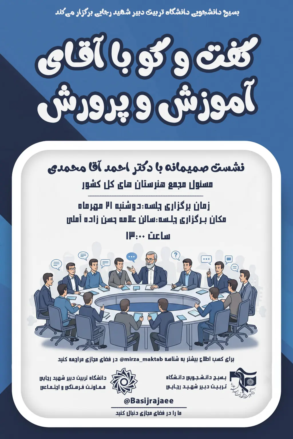 به دعوت بسیج دانشجویی دانشگاه تربیت دبیر شهید رجایی، جناب آقای احمد آقامحمدی، سرپرست مدارس دوره متوسطه دوم فنی حرفهای و کاردانش سراسر کشور، روز دوشنبه 21 مهرماه در جمع دانشجویان دانشگاه حضور یافت. این برنامه با هدف تقویت ارتباط میان نهادهای اجرایی و دانشجومعلمان دانشگاه و ظرفیتهای مشترک همکاری برگزار شد.